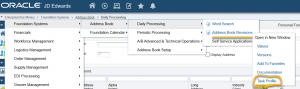 So, let’s add a new shortcut to call the Address Book application. Again, we can skip the lengthy navigation steps and launch the Address Book directly if we know the program ID. For this article, pretend we don’t know the program ID but have been provided the navigation steps. Using the navigation steps, let’s get the JDE supplied Task ID information needed to add the shortcut. To get the Task ID, navigate to the Address Book application path, don’t click but right click on the application to show the application Task Profile as shown below.