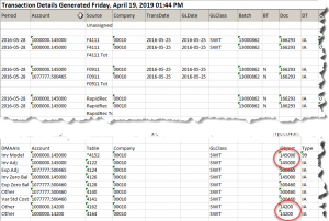 Notice the DMAAI section for this failed inventory adjustment transaction. There is a discrepancy in the balance sheet accounts across the tables. RapidReconciler scans the tables for instances of the document type and GL class code used in the actual transaction for analysis.