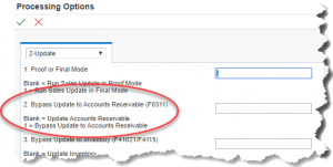 The sales update batch program has a processing option (as shown below) where the update to A/R can be turned off. Setting option 2 on the update tab to a “1” will stop A/R generation. Of course, this means we need a dedicated version of R42800 just for these order types.