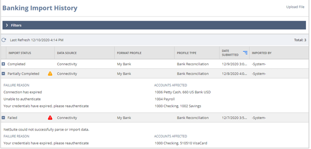 On the Banking Import History page, there is a new import status, Partially Completed. This status applies to imports in which NetSuite did not successfully retrieve data for all bank or credit card accounts. You can troubleshoot import errors on the Banking Import History page. For more information about the Partially Completed status, see the help topic Banking Import History.