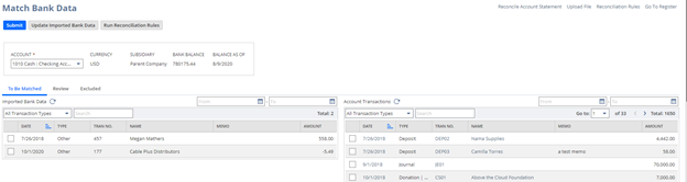 • Match Bank Data – If you select an account for which NetSuite failed to import data during the latest import, a popup message displays the most recent import error. See the help topic Matching Bank Data. For permission details.
