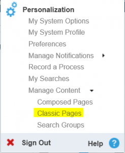Managing the E1 Landing Page as of tools release 9.2.3.x can be launched from the Roles and Personalization drop-down on the upper right corner right next to your JD Edwards Enterprise One login. The Classic Pages application can be found under Personalization, Manage Content: