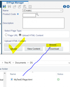 Unlike Page URL type, the other radio button to build the E1 Landing page is internal and straight forward to pull and upload, browse on pre-built html objects in the saved location to load: