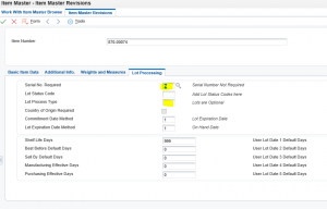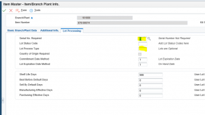 Serial No. Required should be set to “Y” and Lot Process Type set to “4”.