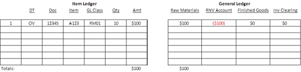 So why the 3 steps? Although it seems like a lot of effort just to change a code, let’s have a look at what happens without the inventory adjustments. Consider a brand-new item (A123) that was initially classified as raw materials (RM01). We do our first transaction, a PO receipt, which adds quantity on hand and debits the raw material account, credits received not vouchered: