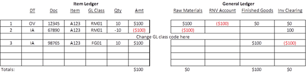 Notice the IA transactions accomplish 2 things. It results in a net zero item ledger summarization for the RM01 class code and it reclasses the amount from raw materials to finished goods. Both of these things are very important for reconciliations. As a note, all of the transactions should be done in a timely manner as you don’t want other activity happening while the change is in process.