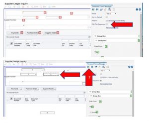 - From the personal forms manager, you have a couple of options. You can either set it as default. That way the personalized form is the form that will always show up first when you open the application. You can select the edit tab sequence if you prefer using the tab button. You can resize the fields by hovering on the outside of the field. You can also change the data inside the field by typing inside of the field. Using the tab sequence is useful for quick filtering for a search or if you want faster data entry. If the tab sequence is to your specification uncheck the edit tab sequence and click the save button which looks like a floppy disk with a green check mark. *E1 starts their tab sequence with 2