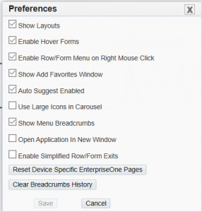 “Preferences” - will let you personalize or customize your whole JDE interaction to hide or show layouts. It will also let you clear breadcrumbs history and reset E1 pages among other things that are turned on.