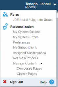 This will just show the user ID and the logged in environment and if JDE roles changer is turned on, this section will also show a dropdown button where you can change roles for this environment.