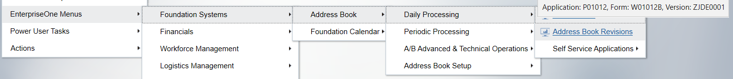 Breadcrumbs (E1 Tools Release 9.2) allows us to keep track of the menus we have used to navigate to our current application. When clicked, each breadcrumb displays the associated menu and its submenus at the location of the breadcrumb. If we use breadcrumbs to navigate in EnterpriseOne, the breadcrumb string changes to reflect the new navigational path we have chosen. Breadcrumbs do not appear if we use Fast Path or EnterpriseOne Pages to launch an application.