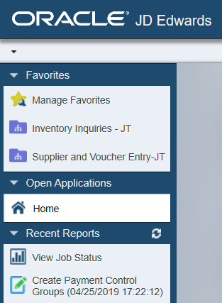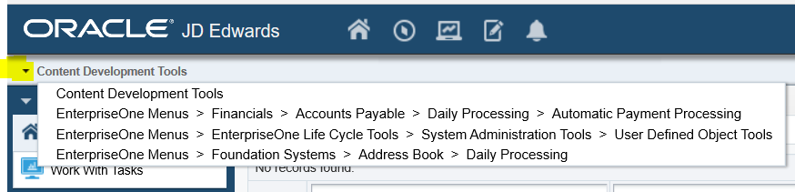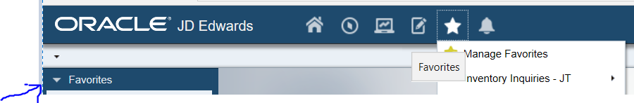 It's the little "star" icon sitting on top of the user interface. The favorite tasks and folders are also displayed in the Favorites tab in the carousel container. The Favorites menu displays all the tasks and folders that we added. Unless provided and migrated from an upgrade, we will have to add Favorites based on how we want to speed up task navigations. JD Edwards Enterprise One installations do not deliver this feature with pre-populated task.