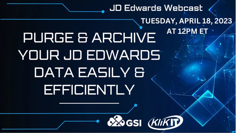 Purging and archiving data from your JD Edwards system helps you achieve your organization’s data retention policies but can do a lot more. Join GSI and the Klik IT team as we discuss some of the values of archiving your JD Edwards data. Klik IT’s archiving solution Purge-it! built exclusively for JD Edwards makes the process easy to use and fast to implement.
